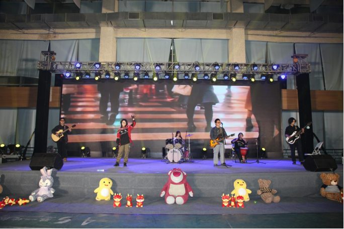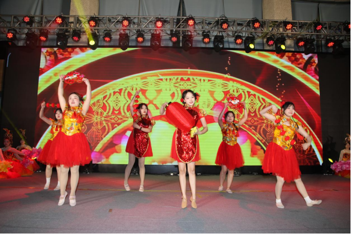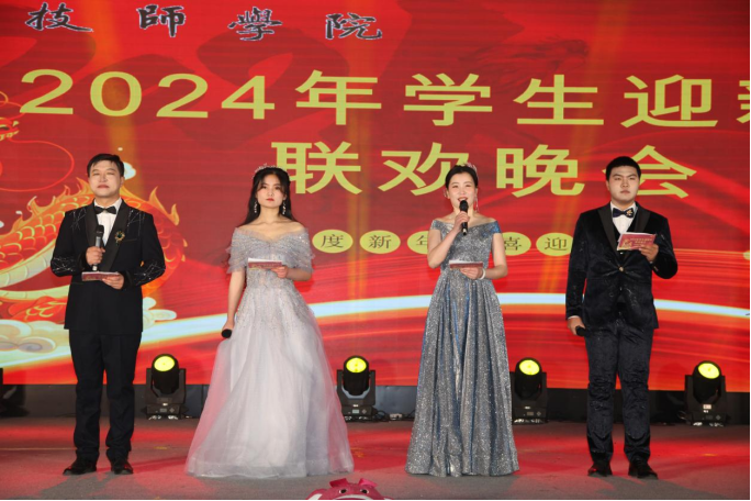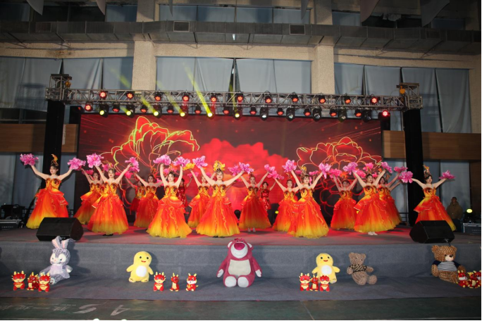 本场晚会由现代服务系表演的开场舞《龙腾虎跃闹新春》拉开帷幕。