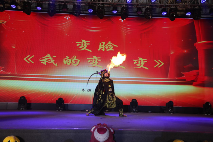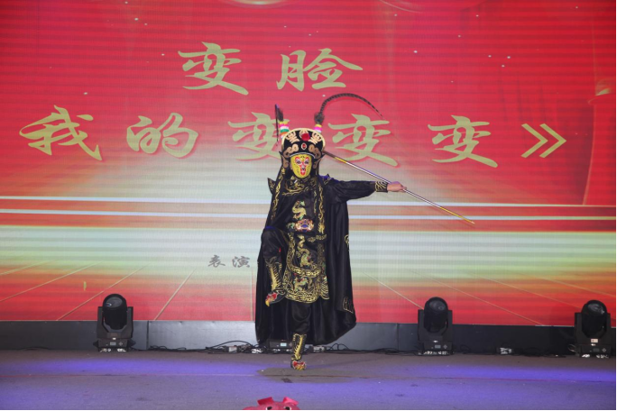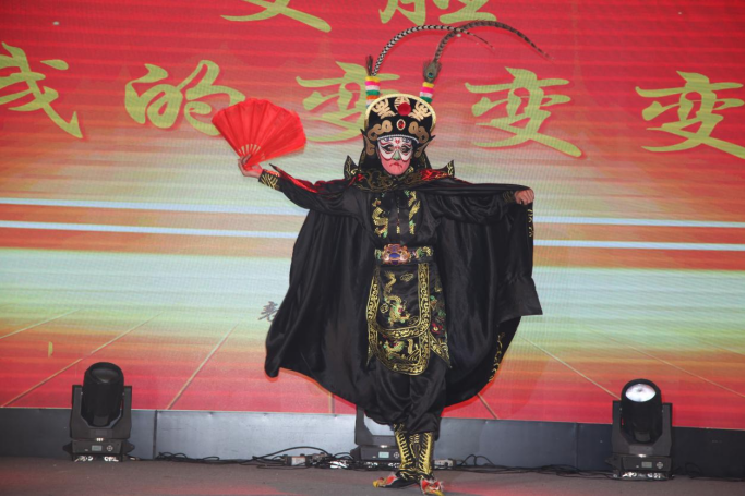 现代服务系学生赵特为大家带来了技惊四座的川剧变脸表演,以魔术般的技法,变幻出形态各异的脸谱,并穿梭于台上台下,在全场观众的欢呼中,演绎着变脸绝技的神奇与魅力。