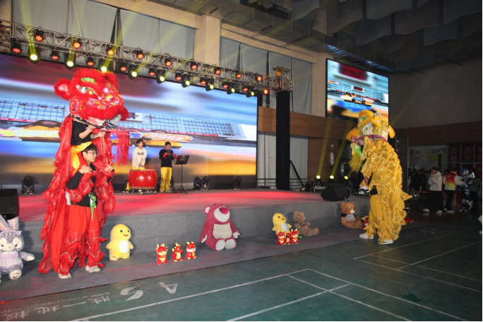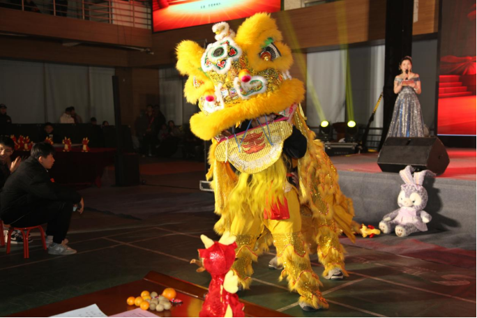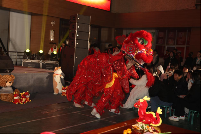 现代服务系的舞狮表演《雄狮迎新春》,伴随着铿锵有力的鼓乐,两只憨态可掬的“小狮子”在现场腾挪跳跃,赢得现场观众的满堂喝彩。